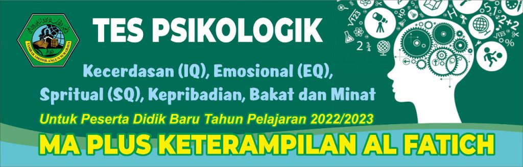 Pagi ini Sabtu, 16 Juli 2022 siswa baru kelas X di MA Al Fatich tengah menjalani segenap tes psikologi. Tujuannya tak lain adalah untuk melihat bagaimana kepribadian, bakat serta minat siswa disamping juga untuk mengetahui IQ, EQ, serta SQ siswa MA Al Fatich. Melalui tes psikologi ini, siswa dapat diarahkan kemana nantinya jenjang yang sesuai dengan bakat dan minatnya. Kegiatan semacam ini adalah kegiatan rutin tiap tahun yang diberikan kepada siswa kelas X MA atau siswa baru.