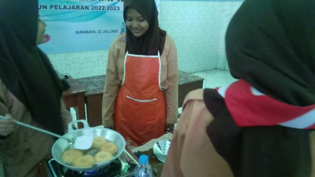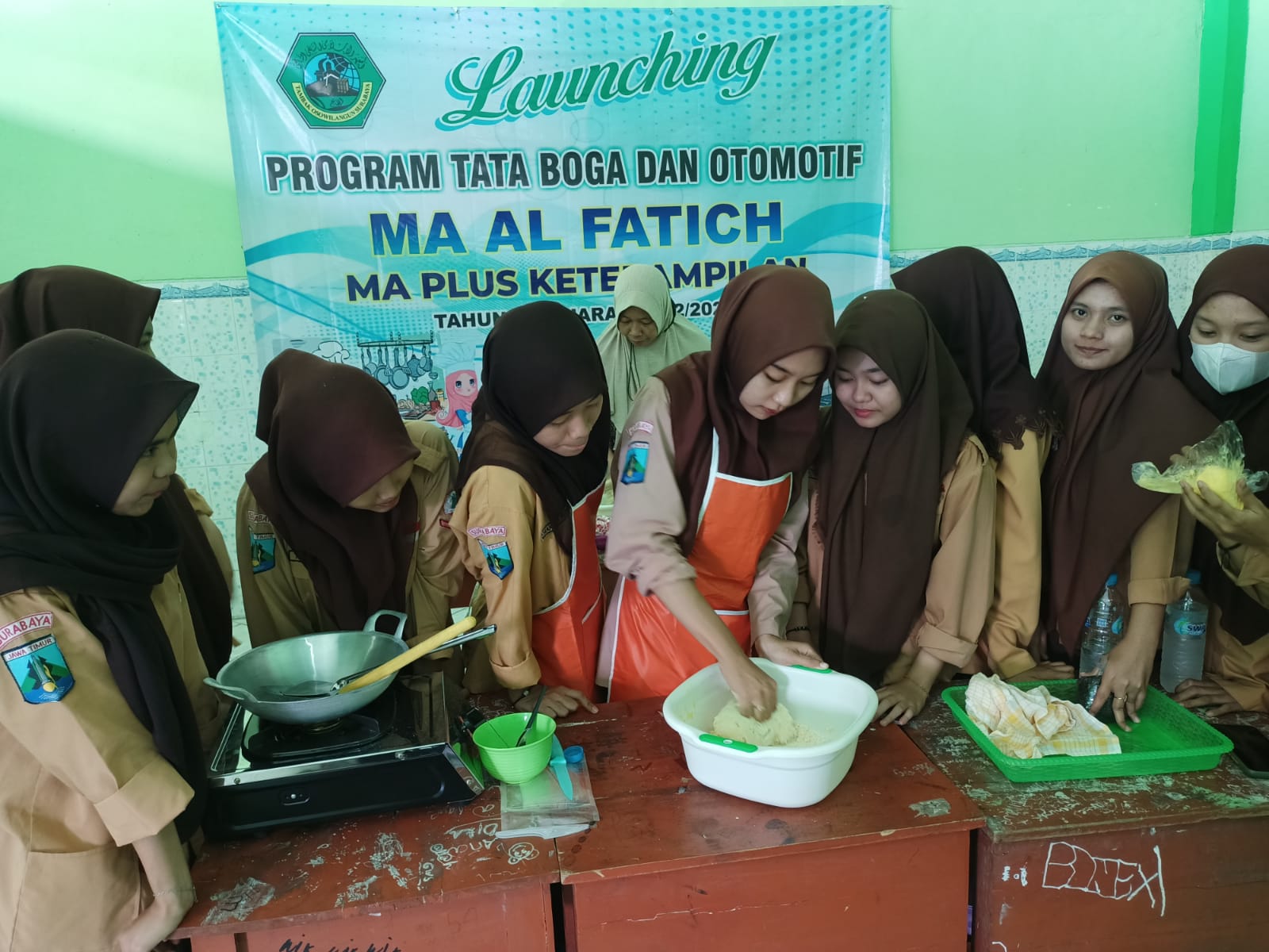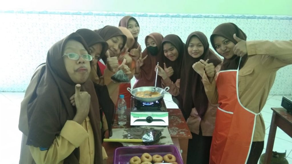 Pada pertemuan pertama, kegiatan tata boga adalah membuat kue donat. Setiap jenjang kelas memiliki bahan dan peralatan masak layaknya chef di telivisi, ya… walaupun tidak sekeren di TV akan tetapi mereka sudah merasakan seperti itulah modelnya. Alhamdulillah semua jenjang kelas dapat menyelesaikan praktik di hari pertama ini. Semoga keterampilan memasak siswa MA Al Fatich semakin meningkat seiring perjalanan waktu di pertemuan selanjutnya. Amiin…
