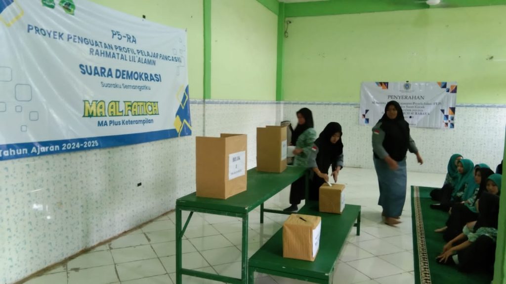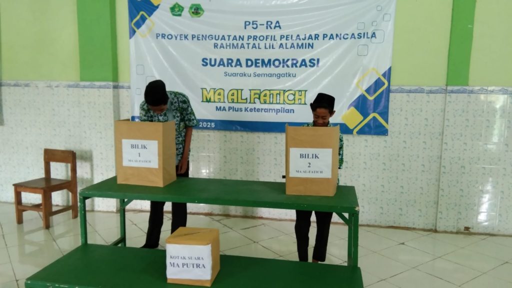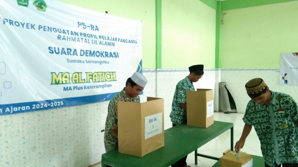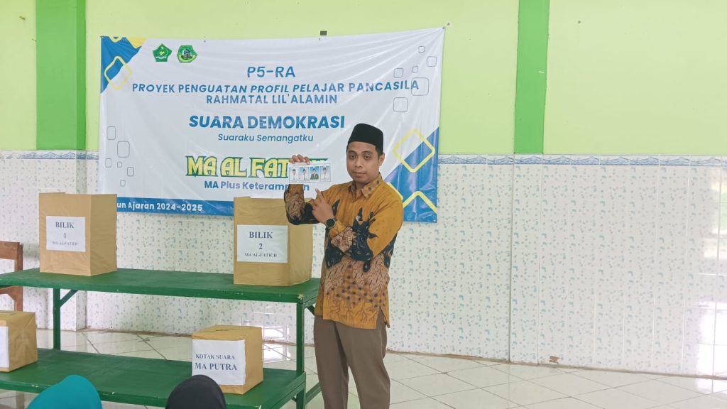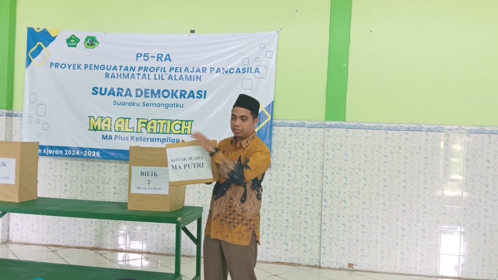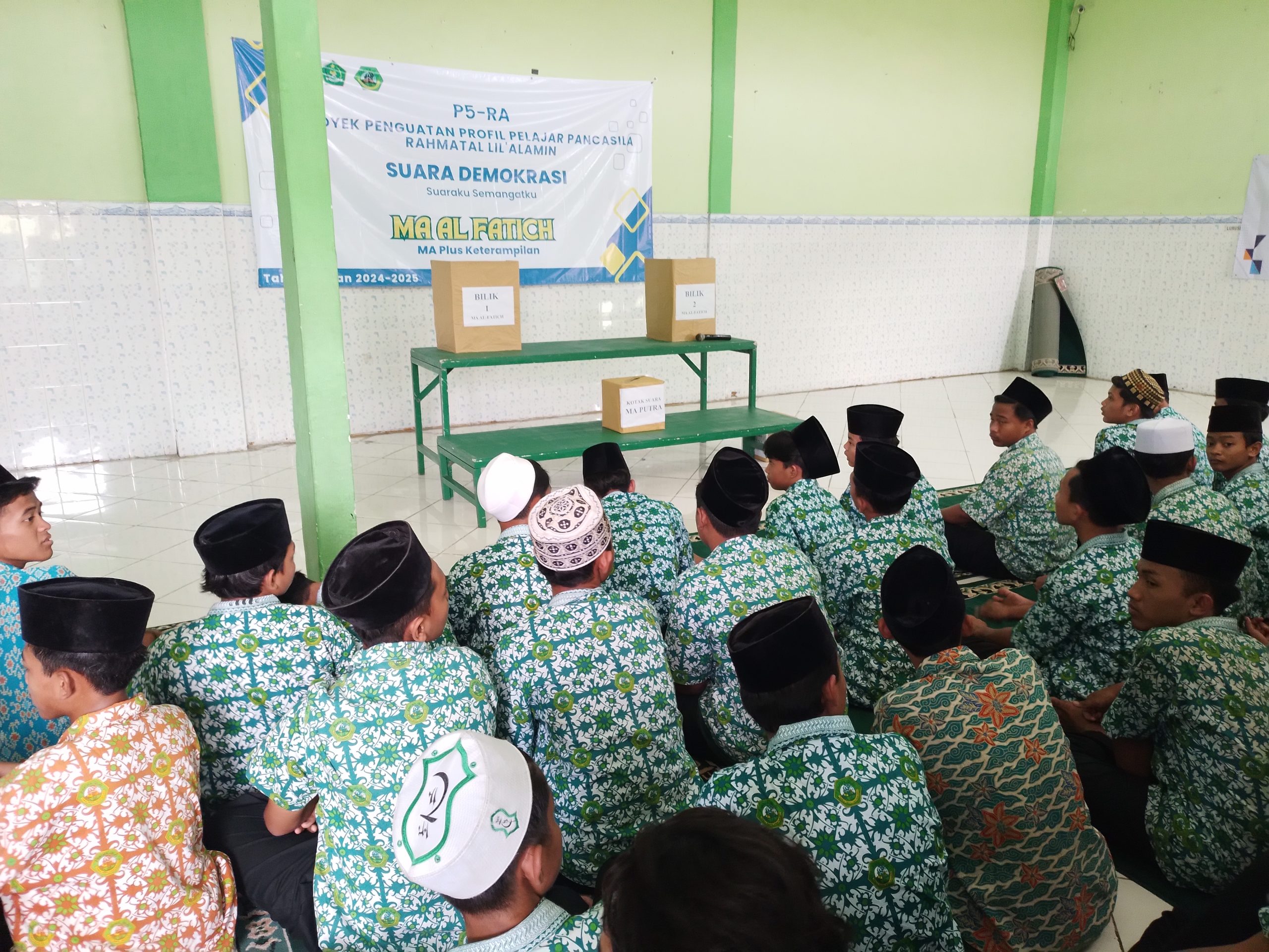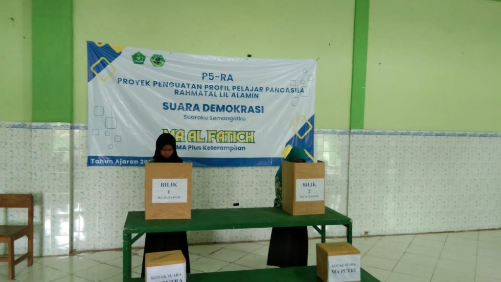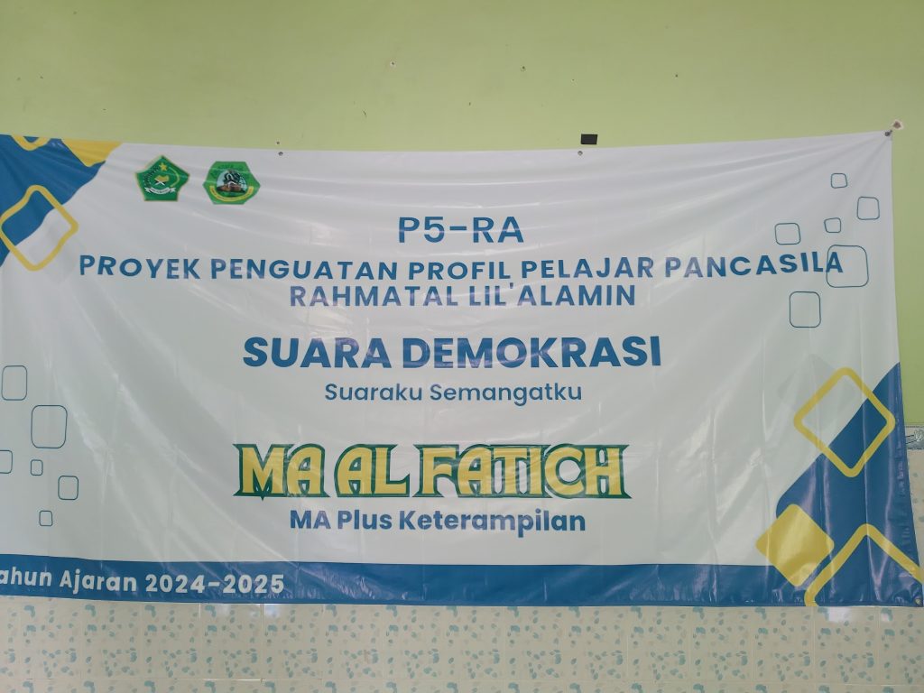 Pada hari rabo tanggal 7 agustus 2024 MA Al Fatich mengadakan kegiatan P5-RA (Proyek Penguatan Profil Pelajar Pancasila Rahmatan Lil Alamin. Kegiatan ini dilakukan oleh para peserta didik ma al fatich yang dikomandoi oleh bapak miftahul alim,M.Pd. selaku Waka Kesiswaan, kegiatan ini mengusung tema “Suara Demokrasiku, Suaraku Semangatku”. Tema tersebut diambil karena bertepatan dengan pemilihan ketua osis yang baru periode 2024-2025. Harapannya diadakan kegiatan ini bagi siswa -siswi ma al fatich sebagai pembelajaran pentingnya demokrasi di sekolah bahkan di negara kita tercinta indonesia. Semoga mereka bisa memetik pelajaran tersebut dan nantinya bisa diamalkan di masyarakat.
