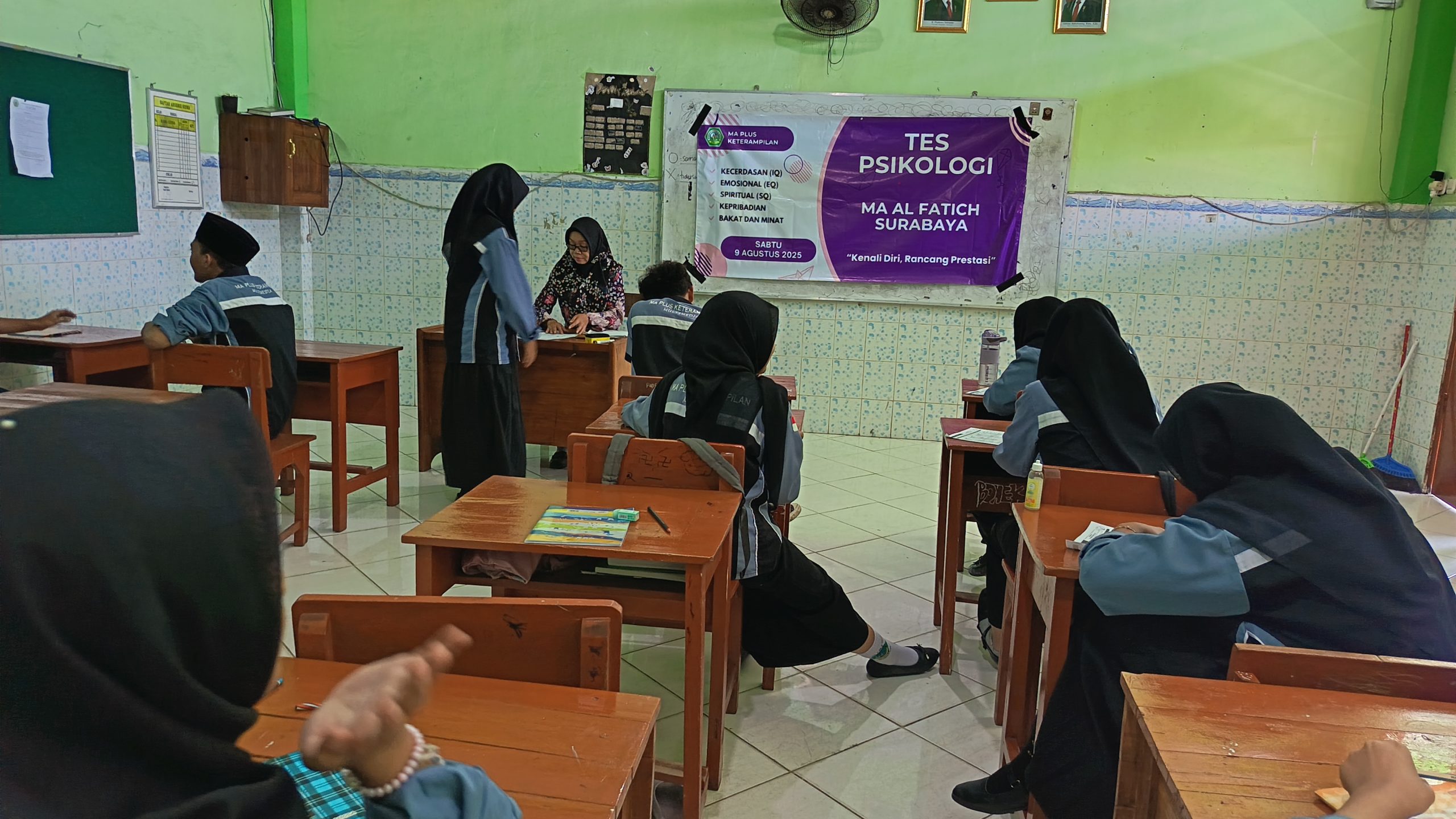 Pada hari Sabtu tanggal 09 Agustus 2025, seluruh siswa kelas X baik terpadu maupun reguler MA Al Fatich Surabaya mengikuti kegiatan tes psikologi sebagai bagian dari rangkaian awal tahun ajaran baru. Kegiatan ini bertujuan untuk mengidentifikasi kepribadian, bakat, minat, serta mengukur IQ (Intelligence Quotient), EQ (Emotional Quotient), dan SQ (Spiritual Quotient) setiap siswa.